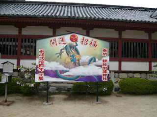 The main building is built in the Hachiman-zukuri style, with two aligned buildings connected by a raingutter between the two roofs. The space underneath the gutter is known as the ai no ma. The front half is in the nagare-zukuri (flowing) style, the rear half in the kirizuma-zukuri (gable roof) style. The Lattice Wall has a tile roof with lovely green diamond-shaped lattices. The Moshidono has a cypress shingle roof, with the front of the building, parallel to the ridge, open to the outside. The Romon is made in the irimoya-zukuri (hip and gable roof) style, with double eaves and a clay tiled roof. The guardian king statues at the four corners of the room area are a rare feature. The woodword and decorative carvings of the buildings are painted red, with touches of white and other colors, while the pillars of the main building are covered with gold leaf, all in splendid Momoyama period (1573-1603) style. The wooden Kairo (corridor), which is over 100m in length, and a stature of Saint Ippen are evidence of the long history of Shinto and Buddhist syncretism. – Matsuyama Board of Education.